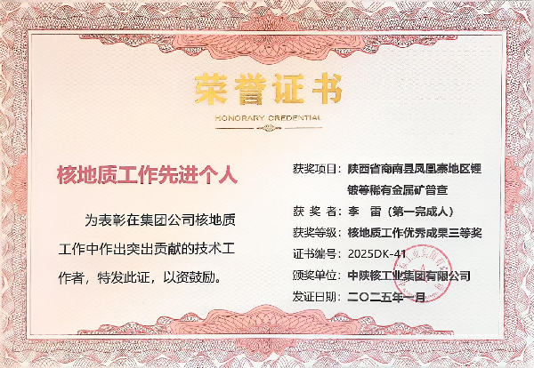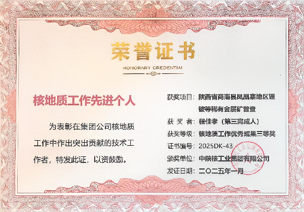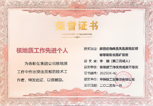 中陕核工业集团有限公司2024年度优秀找矿成果三等奖 地质调查院陕西省商南县凤凰寨地区锂铍等稀有金属矿普查项目